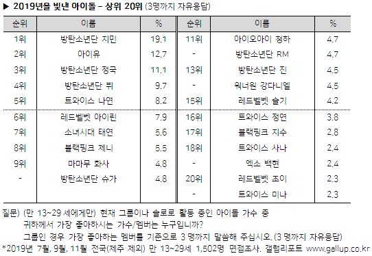 韓国ギャラップが、「10代~20代が選んだ2019年好きなアイドルTOP20」を公開しました。
