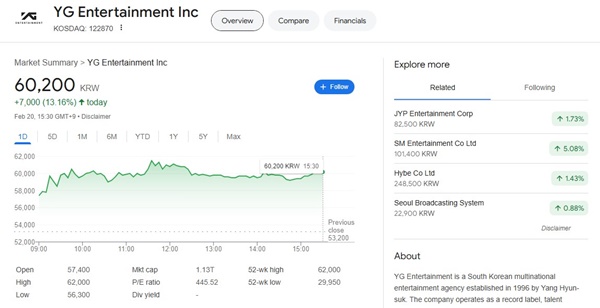 報道を受けて、韓国のK-POP事務所株は20日、大幅上昇。BlackPinkワールドツアー公演の日程を発表したYGは、10%以上あげています。