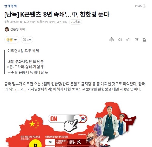 韓国経済は「中国政府が早ければ5月頃に限韓令(韓流コンテンツ禁止令)を解く計画であることが把握された。韓国のサード(高高度ミサイル防衛システム)配備に対する報復として、2017年に限韓令を出してから8年ぶりのことだ」と報じました。