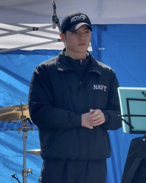 「テヨン」は2024年4月に、海軍軍楽隊に入隊。公開された写真では、「Navy(海軍)」と入ったアウターを着用。後ろには、楽器が見える。