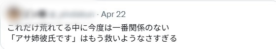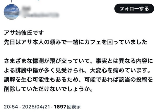 彼氏は「アサ姉彼氏です」とキッチリ自己紹介した上で「アサ本人の頼みで一緒にカフェをまわっていた」「様々な憶測が飛び交っていて、大変心を痛めている。誤解を生む可能性があるため、投稿を削除していただけないでしょうか」と、先述の遭遇したファンへ公開でメッセージを送信。ファンは目撃写真を削除するに至っています。
