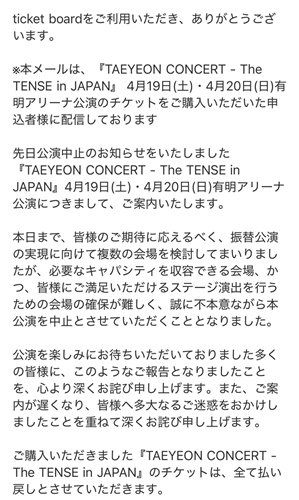 少女時代「テヨン」は4月19日と20日、日本・有明アリーナにてコンサートを開催する予定でした。しかし前々日(17日)、開催中止が急遽発表。振替公演が検討されていたようですが、頓挫しています。