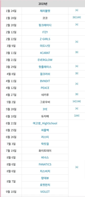 韓国Wikiに掲載されている、「2019年組」リストをみると、「ITZY」以外には解散日が記されています。