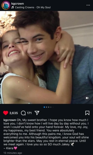 続けて「とても辛いけど、神はあなたを歓迎する。あなたの魂は星より強く輝く。永遠に安らかに眠らんことを。また会う時まで。Jakeyとても愛しているよ」。