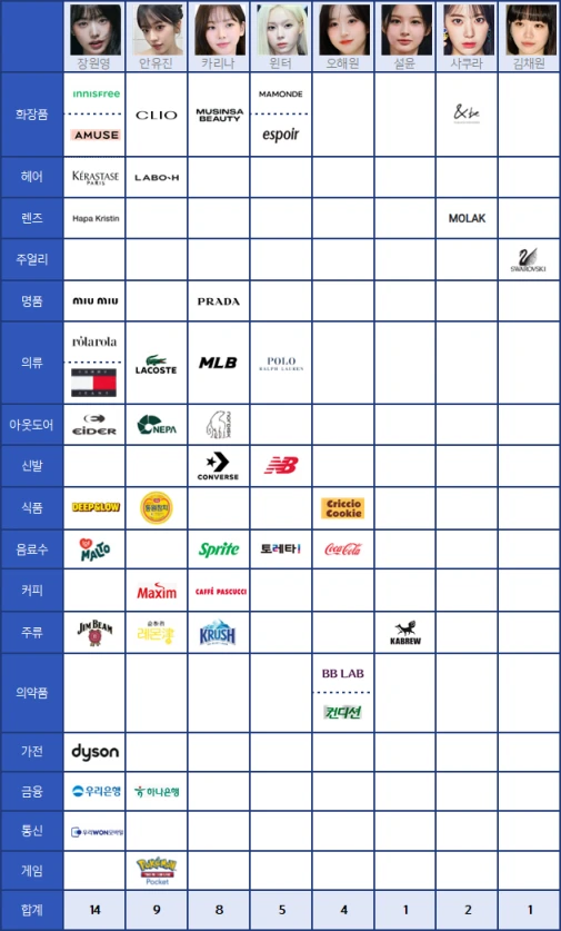 圧倒的に企業ロゴ数が多いのは、IVEの2人。「ウォニョン」はハイブランド(MiuMiu)から、酒類(ジムビーム), コスメ(Innisfre, Amuse), ヘアケア(Kerastase), 家電(Dyson), 金融(ウリィ銀行)まで広い分野の企業と契約。幅広い層に支持されていることがうかがえます。