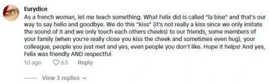 「チークキス」で2人の関係について憶測が出ると、現地ファンが説明に乗り出すことに。「フランス女性として言わせてもらうけど、これは”la bise”と言われいる一般的な挨拶。友達にも家族にもするし、同僚や嫌いな人にもするんだ。お役に立つと良いけど」と書き込んでいます。
