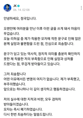 ジョングクは「久しぶりに皆さんに会ってからこんな文を書くようになって心が重い。今日のリハーサル中に私が着用した帽子に書かれた文句により、多くの方に失望と不便をおかけした点、心より申し訳ありません」と謝罪。