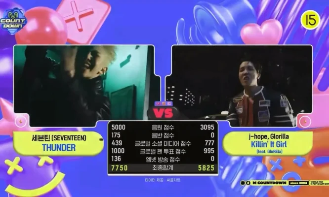6月19日放送Mnet「MCountdown」では、Seventeen「Thunder」とJ-Hope「Killin’ It Girl」が1位候補にノミネート。このうち1位に輝いたのは、Seventeen!
