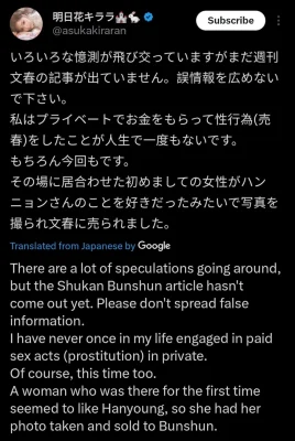 そんな中、元AV女優(明日花キララ)がメッセージを発信しています。騒動について、「いろいろな憶測が飛び交っていますがまだ週刊文春の記事が出ていません。誤情報を広めないで下さい。私はプライベートでお金をもらって性行為(売春)をしたことが人生で一度もないです。もちろん今回もです。その場に居合わせた初めましての女性がハンニョンさんのことを好きだったみたいで写真を撮られ文春に売られました」。Sexしたことは否定しませんでした。