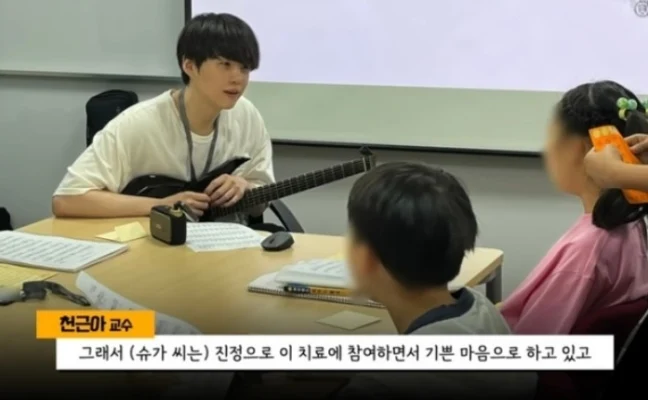教授によると、シュガは社会服務要員として服務していたところ、週末を利用してプログラムに積極的に参加した。プログラムに参加した児童たちは「シュガ」が誰なのか分からないまま、彼を「音楽の先生」と認識し自然に治療活動に没頭したという。教授は「遅刻もせずに誰よりも早く来てギターの練習をして子供たちの目線に合わせて努力する姿を見て、むしろ私が粛然となった。シュガは心から幸せそうに見えたし、すべての治療者が感動した」。