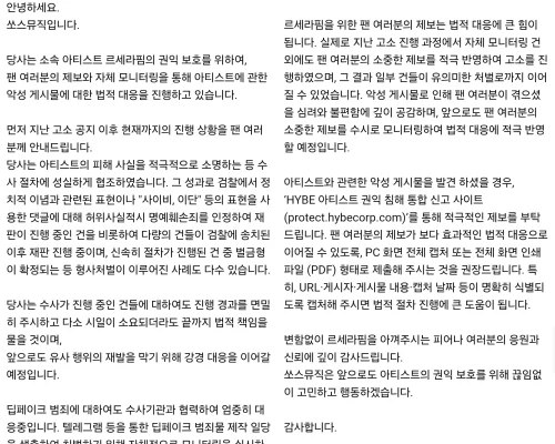 また「今年上半期にもアーティストの名誉を傷つける虚偽事実流布、侮辱、性的嫌がらせなどに該当する掲示物が多数確認された」「モニタリングして悪性掲示物を収集および採証し、これを土台に捜査機関に告訴状を提出、アーティストに向けた悪意的行為に対して一切善処や合意なしに最後まで法的責任を問う」。