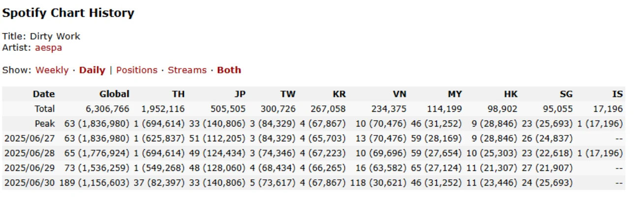 27日リリースされた、「aespa(エスパ)」の1stシングル「Dirty Work」。Spotify「タイ」チャートで、好ストリーミング数を記録していましたが、30日付チャートで異変が見られています。