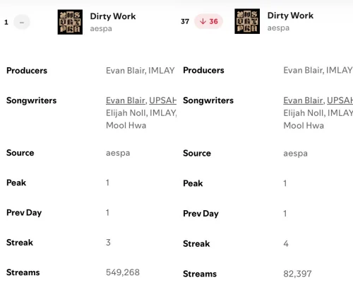 「Dirty Work」については最近、そのSpotify動向が韓国オンライン・コミュニティで注目されていたばかり。タイのストリーミング数の異常な大きさ(リサがいるBlackPinkを上回る)、アイスランドでの順位(200位圏外から1日で1位に)に、一部から不審がる声があがっていた。ちなみに、アイスランドでは、28日付チャートで1位を記録した後、翌日・翌々日チャートで200位圏外になっています。