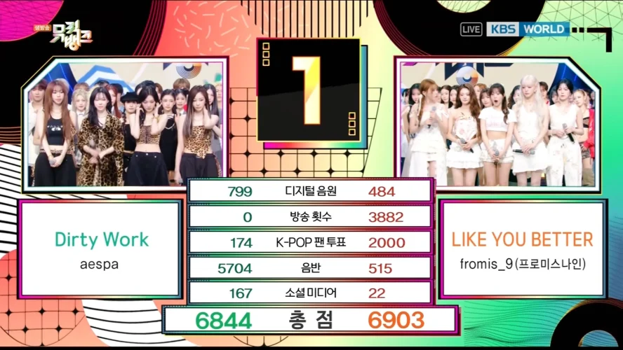 7月4日放送KBS2「ミュージックバンク」では、fromis_9「Like You Better」とaespa「Dirty Work」が1位候補にノミネート。このうち1位に輝いたのは、fromis_9!
