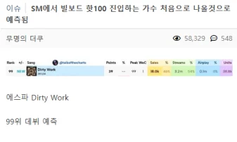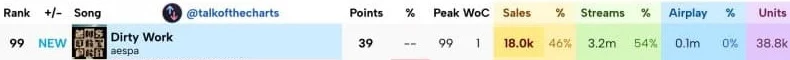 aespa’s “Dirty Work” is predicted to debut at #99 on the Billboard Hot 100.
