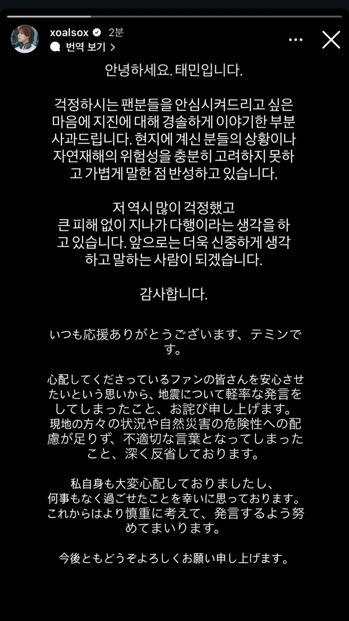 テミンは6日、ストーリーを通じて「心配しているファンの方々を安心させたいと思い、地震について軽率に話したことをお詫びします。現地にいらっしゃる方々の状況や自然災害の危険性を十分に考慮せずに軽く言った点を反省しています」-