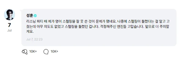 ソンフンは7日、Weverseを通じて「リスニングパーティーの時、私が英語のスペルを間違って書いたのが問題になりましたね。後でスペルが間違っていることを知って直したのですが、何の意図もなくスペルを間違えたのです。心配してくださったエンジン、ありがとうございます。 これからもっと注意します」と、綴っています。