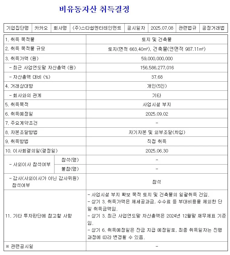 不動産の取得決定とタイトルされた資料が現在、ネット上で拡散。企業欄には、カカオ、スターシップ・エンターテインメントの名が。開示日は2025年7月8日(取得予定日は20259月2日)となっている。