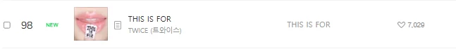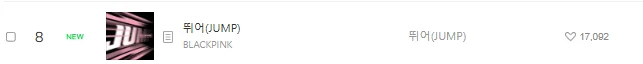 「BlackPink」新曲「Jump」は8位に初登場、ハート数は「17,414」。一方、TWICE「THIS IS FOR」は98位にチャートイン、ハート数は「7,091」でした。