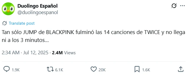 アカウント(@duolingoespanol)は12日、「BlackPink(新曲)Jumpだけで、TWICEの(フルアルバム)14曲を圧倒した。しかも3分かからなかった」とスペイン語で書き込んだ。
