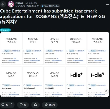 I-DLE所属キューブ、「エクソジーンズ(Xogeans)」「ニュージジ」商標出願!新しいガールズグループ名称?