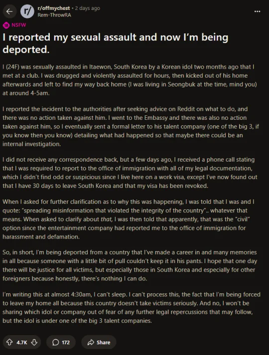 そして「(事務所からの)返信はなかったけど、数日前にあった電話で、入国管理に公的書類とともに報告するよう言われた。労働ビザで滞在しているから、その時は不審に思わなかった。だけど現在、30日以内に韓国から出なきゃいけなくなった、私のビザが取り消された」、「何が起きたか説明を求めると、私が嘘の情報を広めて国の品位を貶めた…から。その後、事務所がハラスメントと名誉棄損で、私を入国管理に通報したようだと言われた」と綴っています。