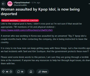 「私(24歳女性)は、K-POPアイドルから性的暴行を受けた」と、被害を訴える書き込みが最近、「Reddit」に掲載され注目されています。