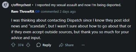 この書き込みの真偽は不明です。K-POP関連のSubreddit(コミュニティ)でも、信憑性が焦点になっており、信じる声や懐疑的な声など様々な反応が出ています。女性は「Dispatch(ディスパッチ)に連絡しようかとも考えた。でも、どうすればいいのか、ソースとして受け入れてくれるか分からなかった」とも綴っている。