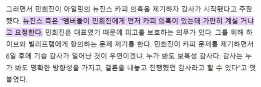 NewJeans側弁護士は「メンバーたちがミン・ヒジンに先にコピー疑惑があるが、じっとしているのかと要請する」と発言。問題提起をすると、その報復として、監査が行われたと主張。(HYBE側は「監査」について「ミン・ヒジンがNewJeansとともに独立を計画したため」と主張。)