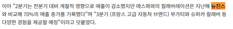 ペ・ドングン最高財務責任者(CFO)は「昨年の歌手『NewJeans』の協業に比べ、aespaの協業の方が、より良い成果を出し、期待値を満たした」とし、「昨年のNewJeansと比べて70%の売上増加を記録した」と明らかにしています。70%増ということはほぼ2倍、顕著な影響の違いが見られたようです。
