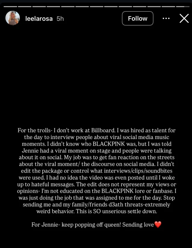 女性インタビュアーはストーリーで「BlackPinkが誰なのかしらない」「私はインタビューの中身や動画をコントロールする立場にない。ただインタビューするタレントとして起用されただけ」「今日起きたら、アンチコメントが来ていた。動画は私の意見でもなんでもない。ただ言われた仕事をしただけ」「私や家族、友人に、殺害予告を送らないで、とってもおかしな行動だ」と綴っています。