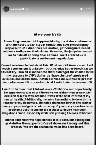 これについて、KGは(2025/08/05)ストーリーで「明確にしたいのは、私はソロキャリアのためにVCHAを脱退したのではない。そんな機会のオファーはなかった。以前も今も」「なぜ脱退しなのかというと、私のメンタルヘルスにベストな選択だったから」「また、私の母親は脱退に無関係だ。お金や個人的利益目的というのは間違った見方だ」と反論しています。