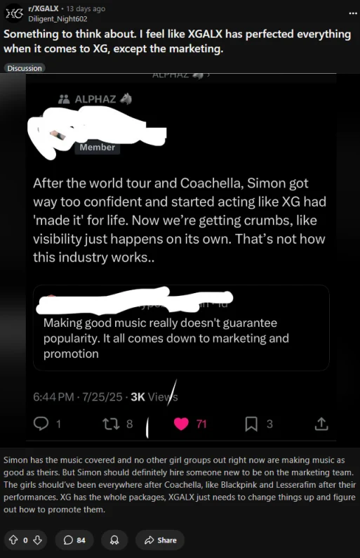 これについて、海外ファンからは、不満の声があがっている。Xでは「良い曲作るだけでは人気は高まらない。プロモーションが必要だ」。Redditでも「マーケティング力が欠けている」「音楽は素晴らしいが、マーケティング人材が必要だ」、「コーチェラ後、世界でもっと露出されるはずだった。BlackPinkやLe Sserafimみたいに」と、不満が寄せられています。