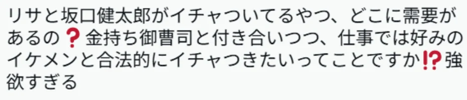 ▼「リサと坂口健太郎がイチャついてるやつ、どこに需要があるの? 金持ち御曹司と付き合いつつ、仕事では好みのイケメンと合法的にイチャつきたいってことですか。強欲すぎる」