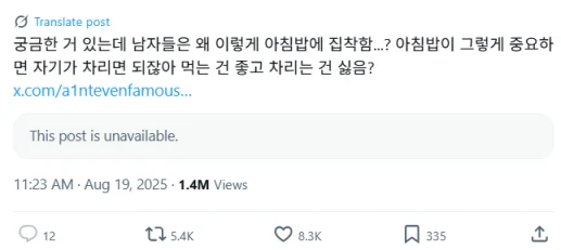 このキャプチャ画像がX上にアップされると、物議をかもすことに。X上では「性認知感受性が発達していない」「本当に覚めるよ」「男たちはなんでこんなに朝ごはんに執着するの…? 朝ごはんがそんなに重要なら、自分で作ればいいじゃない。食べるのはいいけど、作るのは嫌?」と、一部から強い不快感が示されています。前時代的なジェンダーステレオタイプに基づく発言として、受け止められています。