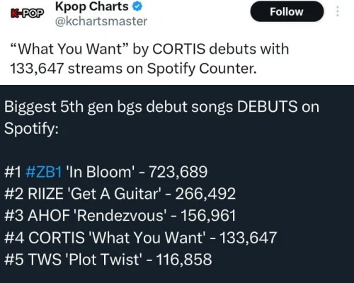 世界最大の音楽ストリーミングサービスSpotifyをみると、初日ストリーミング数「133,647回」を記録。同世代ボーイズグループのデビュー曲初日成績と比べると、ゼロベースワン, RIIZEだけではなく、AHOFの後塵を拝す結果に。グルーバルでも反応はぬるい。ただ、TWSは上回った。