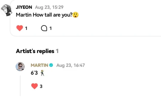 あるファンがWeverseで「身長いくつ?」と質問すると、マーティンは「6’3」と返答。センチメートルに直すと「190.5cm」です。