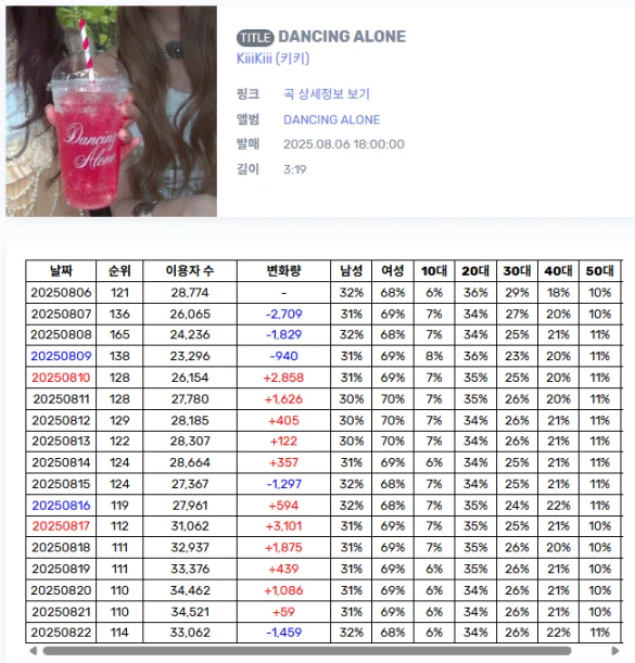 KiiiKiii(キキ)」が8月6日、デジタルシングル「Dancing Alone」(ダンシング・アローン)をリリース。デビュー後初カムバックでしたが、その韓国チャート(Melonデイリー)の成績がさえない。これまでの最高位は、「110位」。100位圏内に入れずにいます。