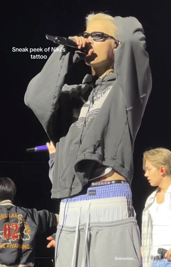 最近、リハーサルに参加した「ニキ」。その際にファンによって撮られた写真が注目されています。ラフな格好のため、露になっている腹部の辺りには、赤い「タトゥー」らしきものが見える。インナーの下に隠れて見えにくいが、唇を模したデザインにみえます。