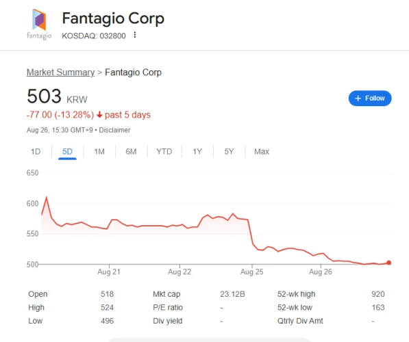 週明け25日、「ファンタジオ」の株価は急落した。直接の引き金は、金曜日の取引終了後、ソウル地方国税庁から82億ウォン(8.6億円)の追徴金を課されたとの発表。2020年から2024年までの5年間、法人税など税務調査によるもので、10月31日までにこれを納付しなければならない。追徴金は自己資本に対して、14.12%に達する規模です。