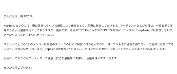 事務所側は27日「ヨンウンは、現在医療スタッフの所見により休息をとり、回復に専念している」「アーティストおよび当社は、一日も早く復帰できるよう最善を尽くしているが議論の末、2025 Kep1er CONCERT TOUR [Into The Orbit : Kep1asia]には参加しないこととなりました」と明らかにしました。