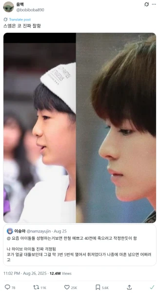 このポストは、「鼻は顔の大黒柱なのに、HYBEは整形でめちゃめちゃにして、40歳を超えたたらどうするんだよ」というポストを引用する形でアップ。投稿主は「リク」について「(HYBEに比べて)鼻が本当に上手」と、変化が自然だと褒めています。