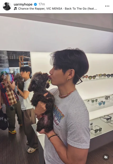 J-Hopeは最近、LAで撮った写真をアップ。その中の1枚には、テヒョンがサングラスショップで、犬を抱っこする姿が。ここで身に着けていた、ネックレスを拡大すると、「JV」とのイニシャルが綴られている。