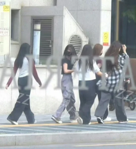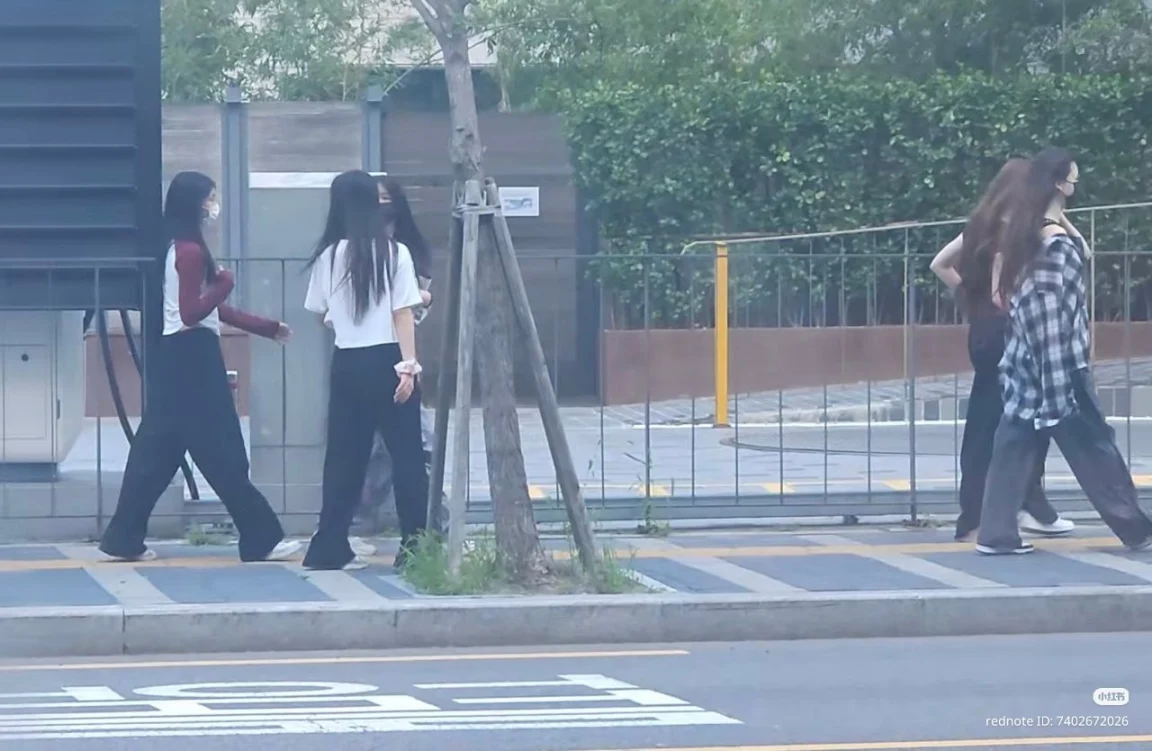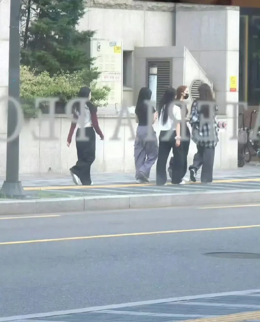 写真には、歩道を歩く「5人」の女性の姿が。若くラフな格好をしています。練習生と見られています、