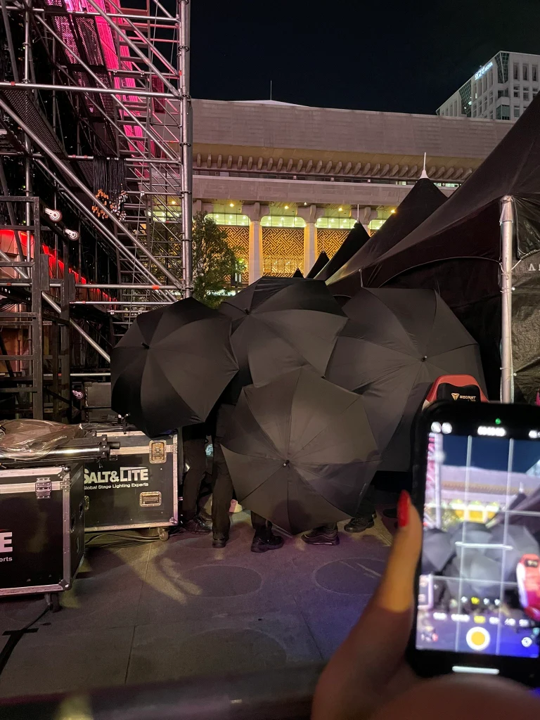 写真には、メンバーの姿は写っていない。屋外に設置された機材がある場所で、開いた状態の多く傘が写っている。手前にはスマホカメラを構える手があることから、「傘」の奥にメンバー達がいるものと推測される。「傘」は撮影や視線をブロックするために開いているようですか、街の中にあの光景があると思うと、異様な光景に思えます。