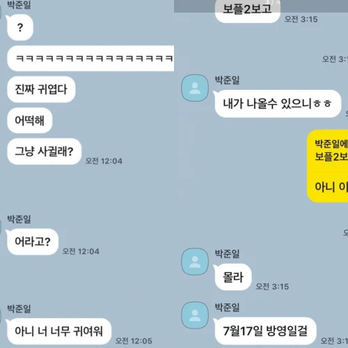 その1つは、カカオトークのキャプチャ画像。「パク・ジュニル」とされる人物は、「可愛い」「付き合おうか?」とのメッセージを送信。相手は、好意を持つ女性のよう。画像には「ボイプラ2報告」との文言も。「私が出るかもしれないから」「7月17日放送だと思うよ」と続けています。