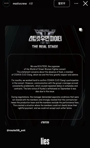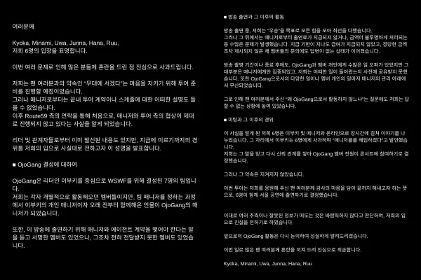 これに対して、公演主催者(ルート59)は反論。「契約協議の過程でOjo Gang側所属マネージャーとの疎通が円滑でなかった。交渉過程でマネージャーが別途の条件を要求し、これにより合意がなされなかった」。「IBUKI」を除く6人も声明文で「イブキ」と「マネージャー」の行動を問題視しています。