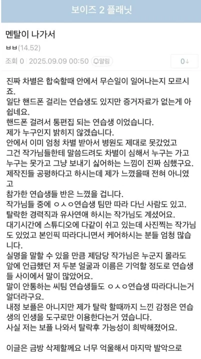 匿名のユーザーは「言葉が通じないCチームの練習生たちも、イ・サンウォン練習生について回っていることを知っていた。内定ボイプル(出来レース)まではないですが、私が脱落するまで感じた感情は、練習生の人生を道具としてのみ利用するということでした。私はボイプラに出て、脱落後の可能性が希薄になりました。この文はすぐ削除します。 すごく悔しくて最後の一発で」と締めくくっています。