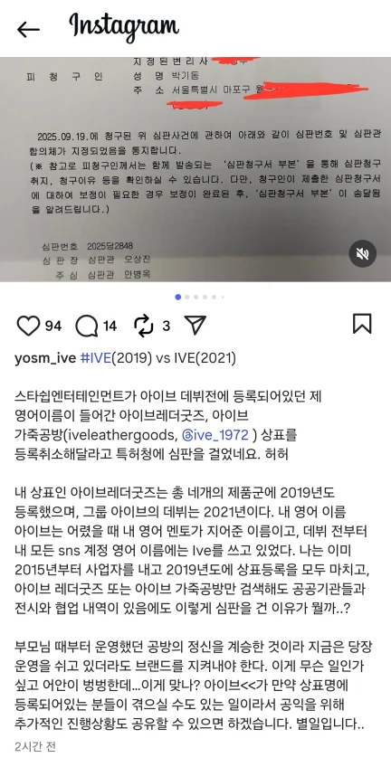事業者は「iveleathergoodsは2019年に計4つの製品群に登録」「IVEデビューは2021年だ。私はすでに2015年から事業者を出して2019年度に商標登録を全て終えた。iveleathergoodsまたはiveleather工房だけを検索しても、公共機関と共にした展示と協業内訳があるにもかかわらず、このように審判をかけた理由は何か」「両親の時から運営してきた工房の精神を継承したものであり、今すぐ運営を休んでいてもブランドを守らなければならない」と、訴えていました。