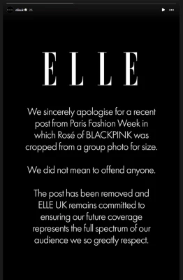 BlackPinkロゼ」が29日(現地時間)、フランスで行われた「サンローラン」パリコレ・ショーに出席。その写真をめぐって批判を受けていた「ELLE UK」が、謝罪しています。